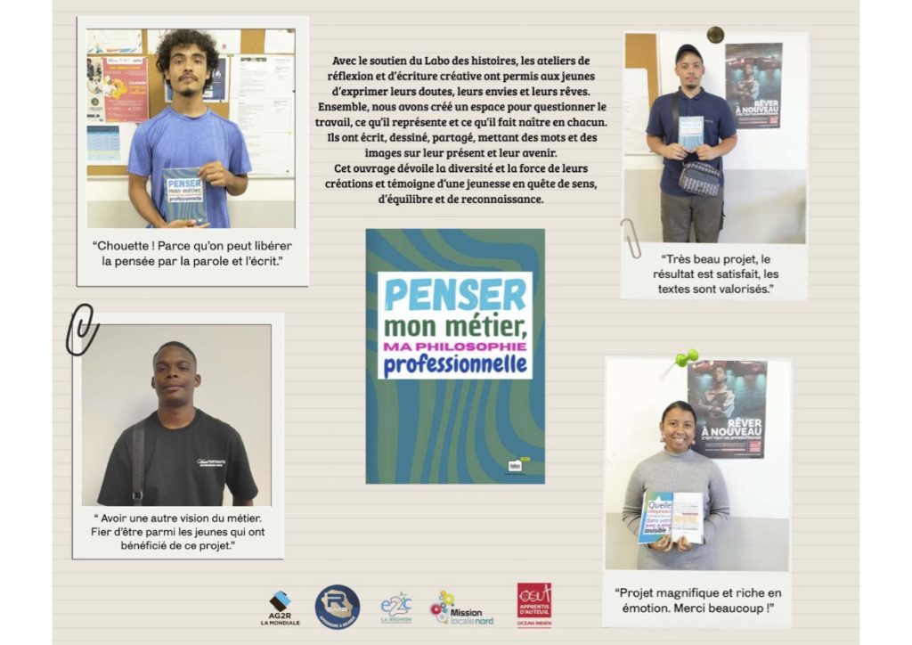 Au printemps 2025, le Labo des histoires – La Réunion a mené le projet « Penser mon métier, ma philosophie professionnelle », un parcours d’ateliers invitant des jeunes en insertion à explorer leur rapport au travail. Soutenu par la Fondation d’entreprise AG2R La Mondiale, dans le cadre de son appel à projets « Accompagner les jeunes ultramarins vers l’autonomie et l’insertion professionnelle », il a été déployé avec plusieurs partenaires de terrain : RSMA, École de la Deuxième Chance, Apprentis d’Auteuil et Mission Locale Nord.